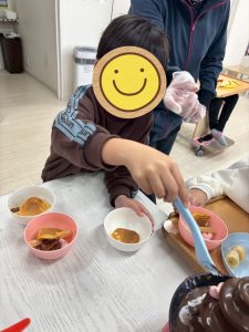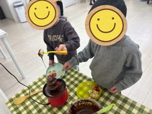 「トロトロのチョコレートはどこで買ったの?」と聞いていた子どもたちには板チョコを見せて「チョコレートを温めると溶けてトロトロになるんだよ!」と教えてもらい、「えぇーーー‼」とびっくりしていました😃
