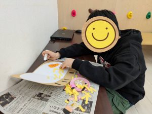 大きな画用紙のお皿に、好きな具材を選んでのりで貼り付け、ちらし寿司を作ります☺
