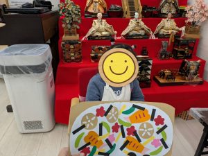出来上がったちらし寿司を手に、7段飾りのお雛様の前で記念撮影をしました📸
