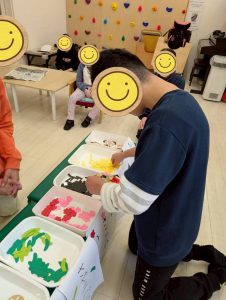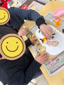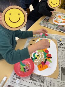 ベタベタする感触が苦手なお友だちも、自分でのりに触らないように工夫していましたが、完成に近づくにつれ、その感触も気にならなくなった様子で、子どもたちの集中力をたくさん見ることができました😌