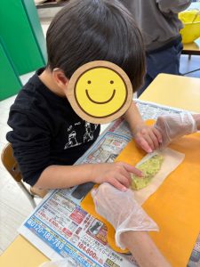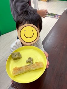 皮の端を持って、くるっと包みます。「折り紙してるみたい~」「うわぁ、はみ出るかも!」と楽しそうな声が聞こえる中、みんなでたくさんの春巻きを包みました😉