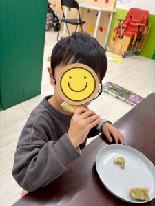 「おいしい!」「皮がパリパリ!」「ミッキーの耳から食べようかなぁ」とたくさん笑っているこどもたちを見て、スタッフもひと安心☺